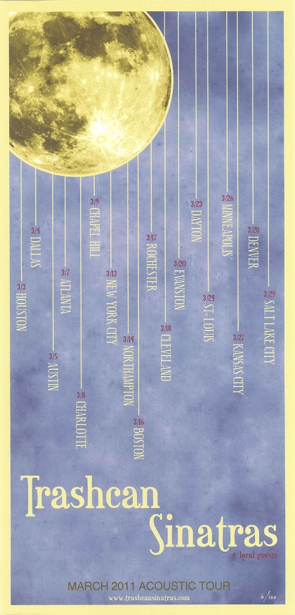 If you’re a newcomer to the Trashcan Sinatras, it’s never too late to get on board. The Trashcans could easily be as widely loved and critically revered as a band like Elbow. They have that same uplifting melancholy and gift for melody for starters, but sadly they appear to be one of music’s best kept secrets. Those in the know are used to waiting patiently for any new album or song or chorus or chord or anything. Luckily though, the band are on a bit of a touring renaissance. The past couple of years have found the Trashcans hard at work on the road. With half the band now living in the States you could be forgiven for thinking this might be a stumbling block. Not so. They have just finished another acoustic tour around the backwater’s of mid-America and beyond – John in his lucky striped t-shirt (see above), driving several thousands of miles in the process – see the tour poster below.
