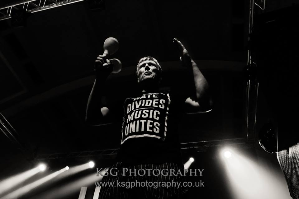 I’m thinking, Rowetta, this is going to be brilliant. And I’m not wrong. It’s a clever opener. The band saunter on in dribs and drabs, easing themsleves into the riff. Rowetta arrives in full-on panto dominatrix role, slowly circling the stage, whipping up a storm with a set of kid’s streamers, building the excitement until Shaun slopes on, all hunched shoulders and hands in pockets swagger. I swear the clock at the back of the hall did a quarter of a century slow-motion reverse.