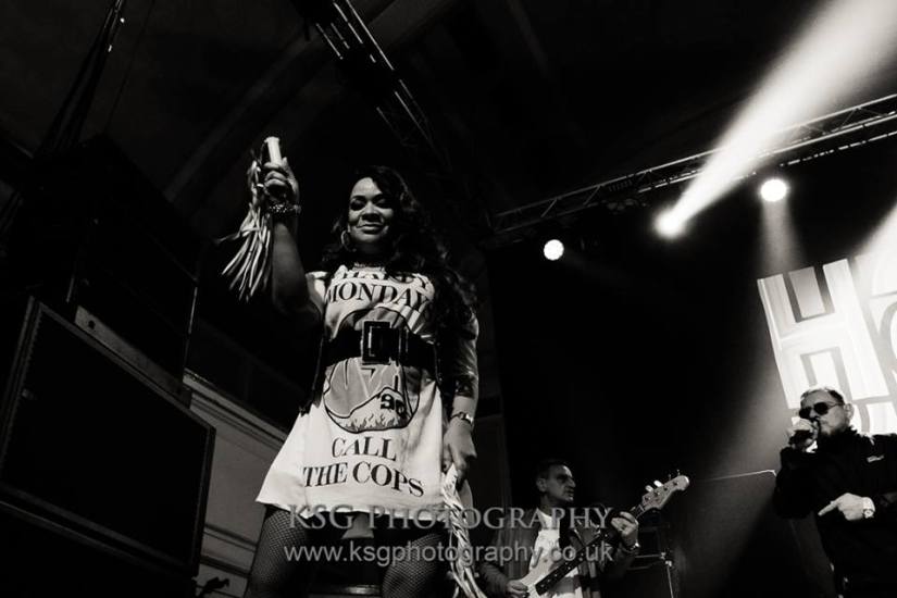 Shaun doesn’t do much else. He never removes his jacket. He never even unzips it. He’s wrapped up for winter even if it feels like the summer of love in here. Occasionally he’ll sidle up behind Rowetta and indulge in a spot of dirty dancing. Rowetta, co-vocalist since those heady days of 1990 is tonight’s panto dame. Alarmingly shorter than I had remembered – she looked like someone had taken a photo of her from back in the day and squashed it without keeping the aspect ratio the same – she wobbled onto stage in custom-made, mile high Adidas platforms, reappearing every other song wearing a different Grand Central Design-inspired costume.