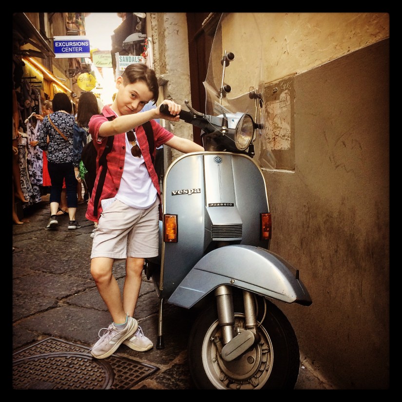 Whether it’s in Napoli and Sorrento in the south or roaming’ further north through Rome and Pisa, I’ve been goggle-eyed at the sheer amount of Vespas on the roads. They’re the great levellers, those wee scooters. Whether you’re a pizza delivery guy or a teenage girl with your boyfriend riding pillion or a businessman in a 3-button suit, open-necked shirt, scarf, loafers and no socks, the best way around town is on one of them.