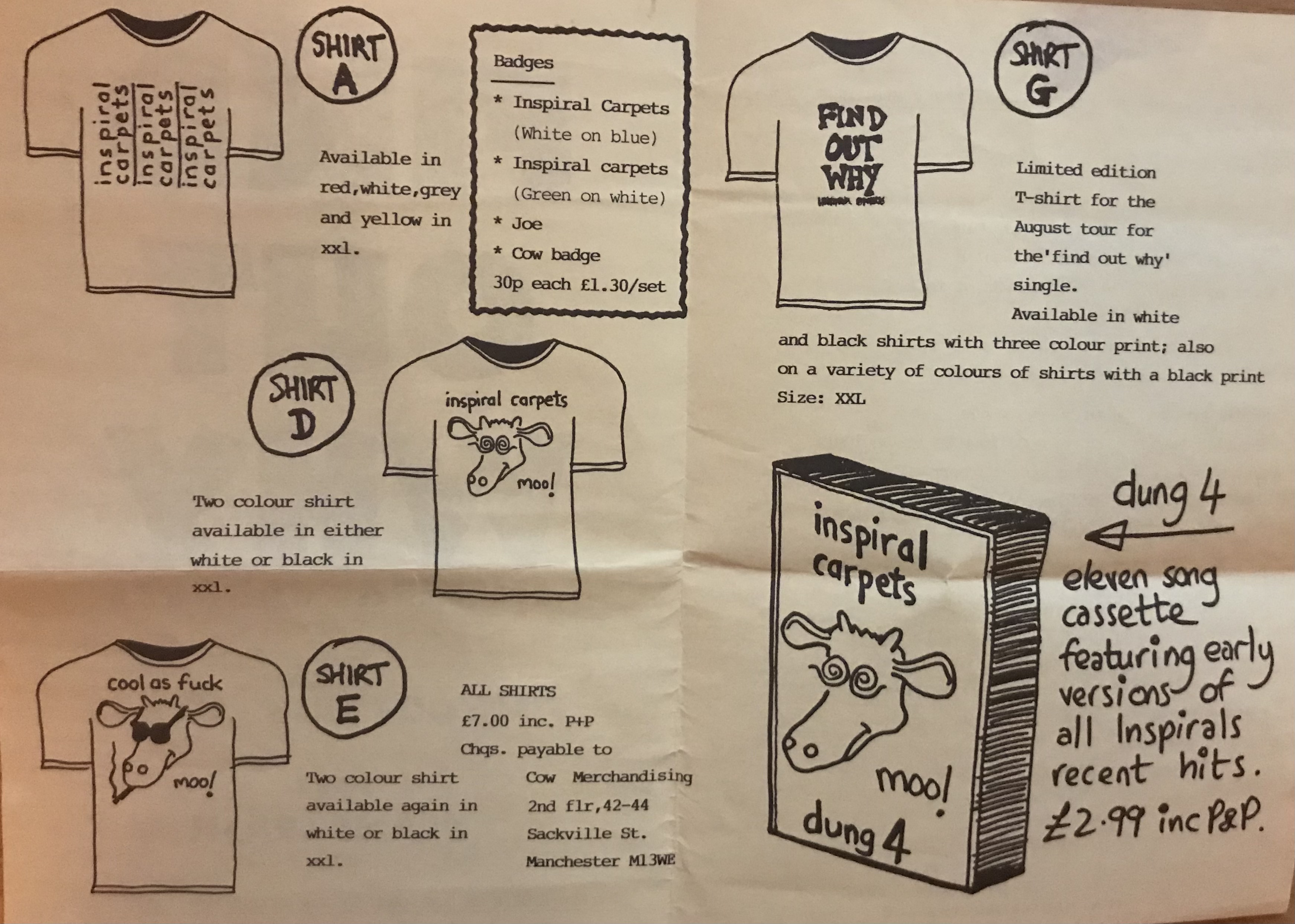 I saw them live a handful of times in those pre-Hingley days and they were always worth catching. And the early records always came with wee folded flyers -‘Moos-letters‘ they were eventually called, with a pudding-bowled nod of the head to the trippin’ cow that would become their logo and record label. You could send away for tapes and t-shirts, proper cottage industry stuff, a product of the fanzine scene of the mid ’80s and a precursor to today’s Bandcamp era. Handily, each Moos-letter charted the band’s rise to success, from Glasgow Tech to Strathclyde University to Barrowlands to the SECC, that Dung 4 cassette steadily rising in price to a giddy £4.49 before being finally unavailable by the time of Moos-letter 5.