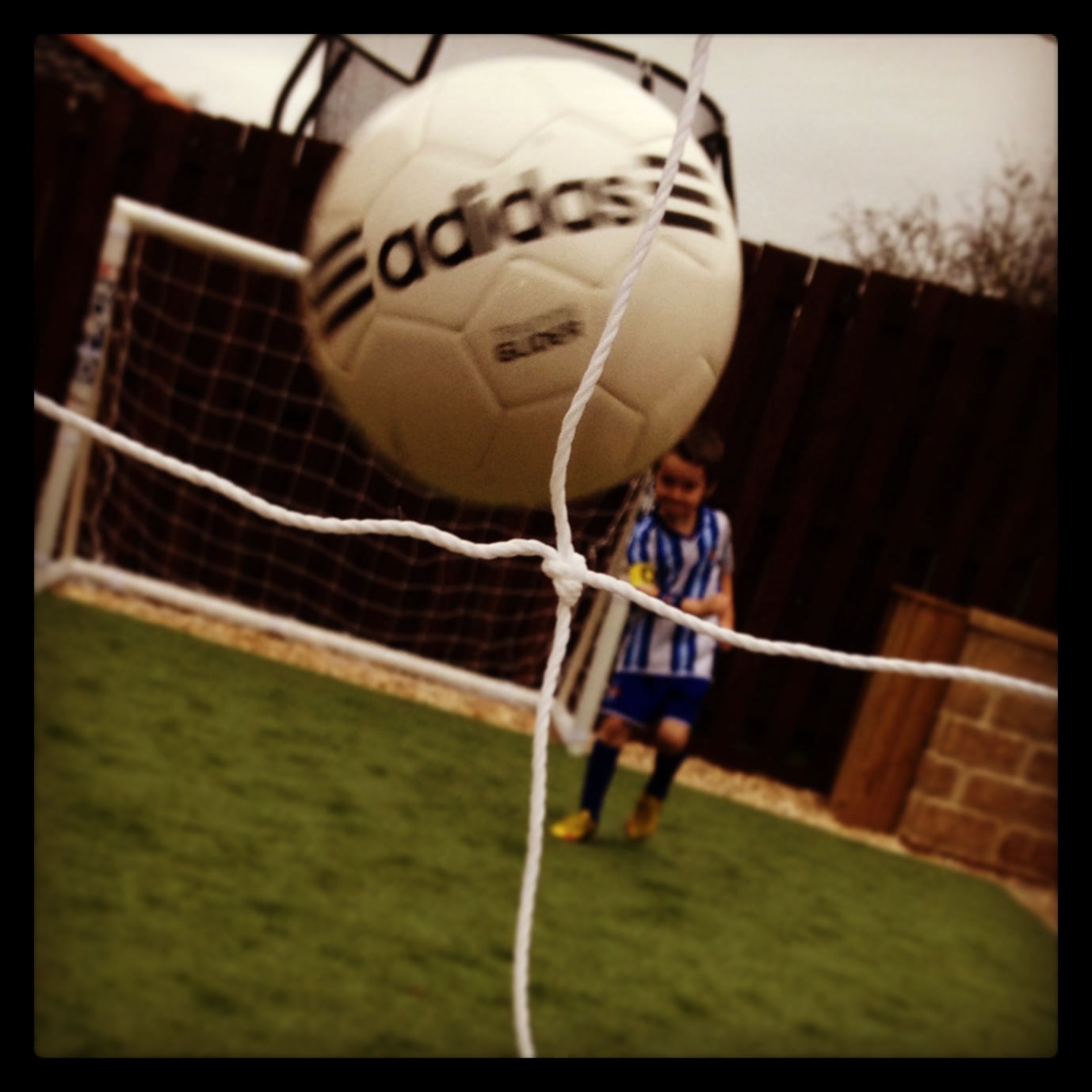 He was football daft. He joined a team. He trained one night a week with them, and the other six nights he’d play with me; passing drills, turning and shooting, shielding the ball, tackling. Everyone – everyone – was bigger than him (not now) and this informal training helped him to develop his game. It’s only in the last year or so that he’s stopped playing, by which time he was the best passer of the ball in the team, the designated corner taker where more often than not his crosses would be met full-on by the head of an aggressive team mate, and the most industrious and hard-working player in the squad, his envied and much talked-about close-control skills honed over hours on his wee pitch out the back door.