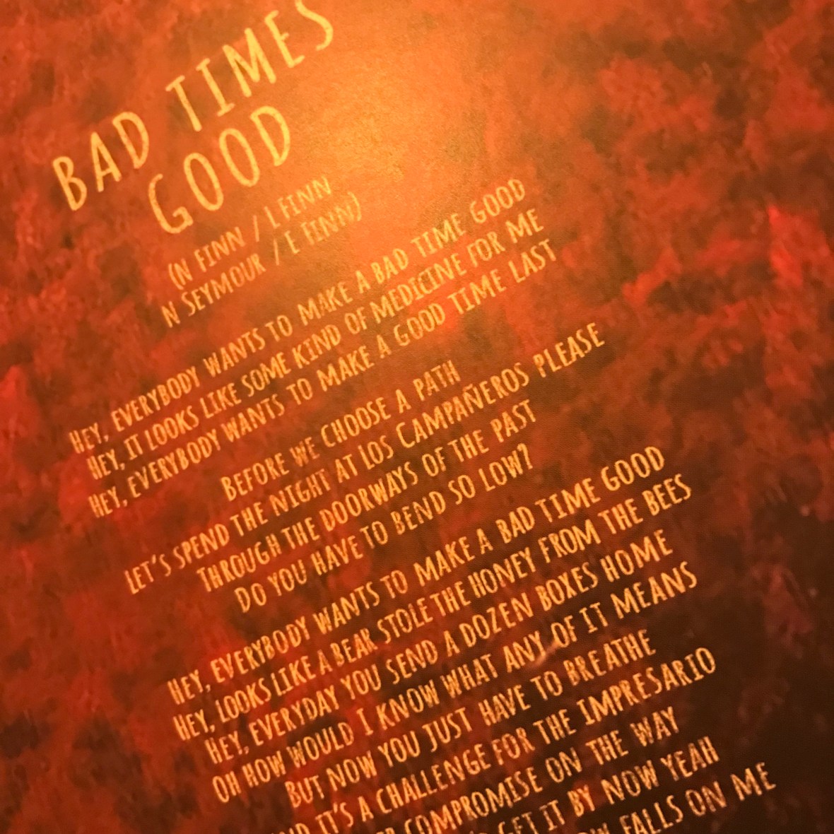 The music that carries Bad Times Good threatens to fly off on a couple of well-placed chiming chords midway through the first verse – ‘Make a good time last/Before we choose a path, let’s spend the night at Los Campaneros please,’ – but Finn pulls it back – ‘through the doorways of the past‘ – you’re not ready for it yet, he thinks, and the tune settles in again. Those chiming, not-quite-expected chords, sometimes the harbingers of deadly night, other times the chink of light in a door half ajar are, it dawns, something of a Finn trademark. Not The Girl You Think You Are…Nails In My Feet…Into Temptation...Distant Sun (great performance from the Tonight Show here) all benefit through the principal songwriter’s way with a well-chosen chord that provides the stepping stone to melodies to die for.