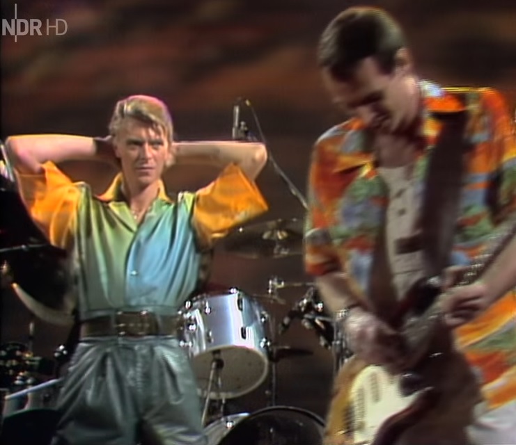 All teeth and cheekbones, and dressed in high-waisted leather trousers and a billowing, massively-collared shirt that my dad might have described as flouncy (a get-up that Spandau Ballet would later sell their plastic souls for), he’s serious, majestic, stately on a brilliant version of Heroes, playful and relaxed on a rollin’ and tumblin’ run through of Jean Genie, and having the time of his life on a rockin’, noo-wavey TVC15, with nothing less than great Bowie hair throughout.