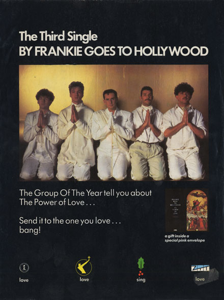 The third single was the surprise package. From a band known for grimy S&M inspired disco and anti-war political baiting, The Power Of Love was a genuine, heartfelt love song. The machinations of the ZTT marketing team – ‘The Group Of The Year‘ – ensured it was released strategically, all eyes focused on capturing the lucrative Christmas Number One slot. The Power Of Love reached the top in its first week of release at the end of November, and continued to outsell all others until Band Aid gatecrashed the party. In the event, 1994’s Christmas top three finished with Band Aid way out in front, with Wham’s Last Christmas at number two and Frankie in third spot. There’s an era-defining top 3 right there.