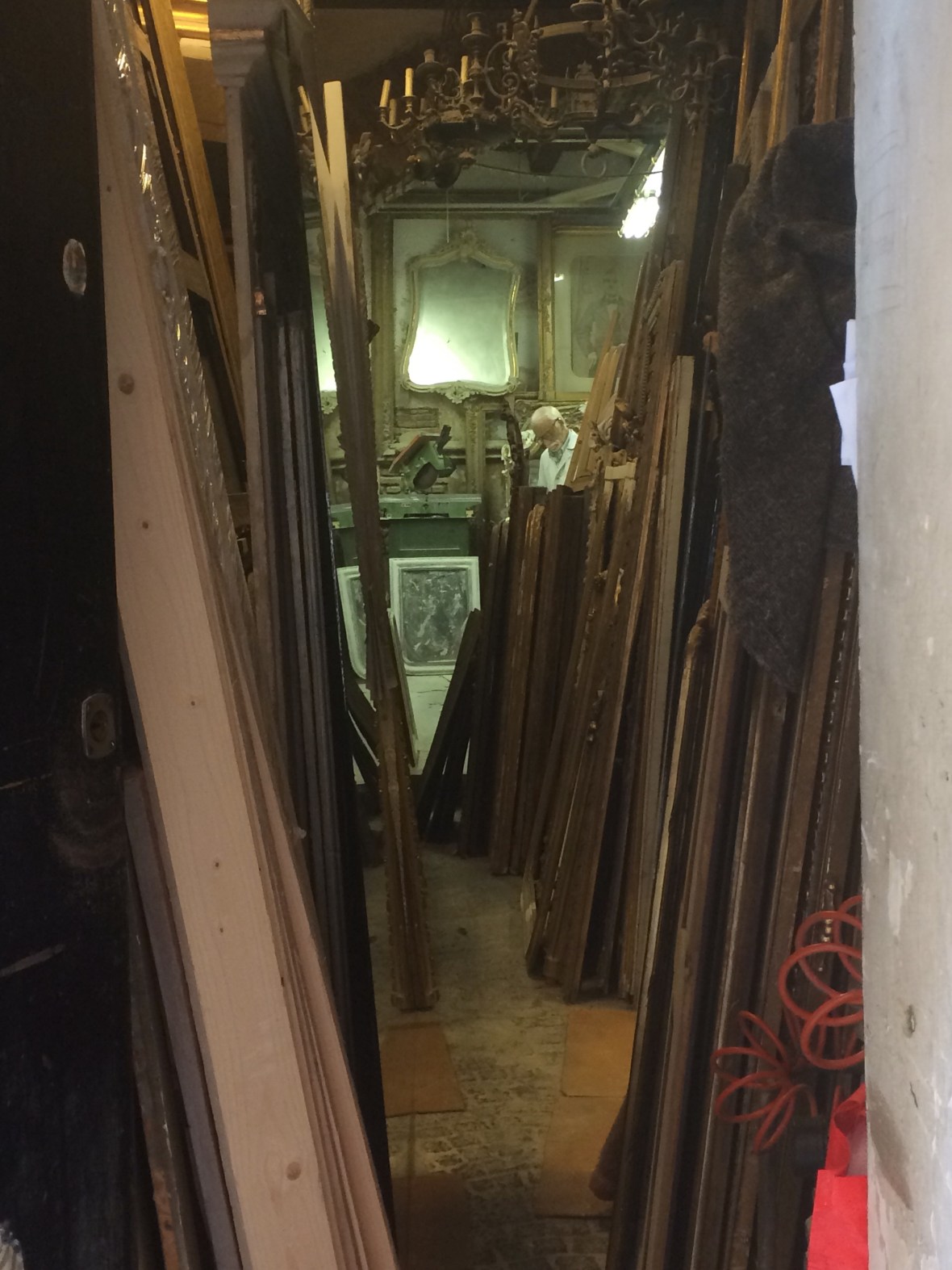 An old man, glimpsed through a door ajar onto an alleyway was dressed in a white coat, slowly and patiently sanding wood. Around him were stacked dozens of picture frames and mirrors, a master craftsman at work using the tools and skills of previous generations.