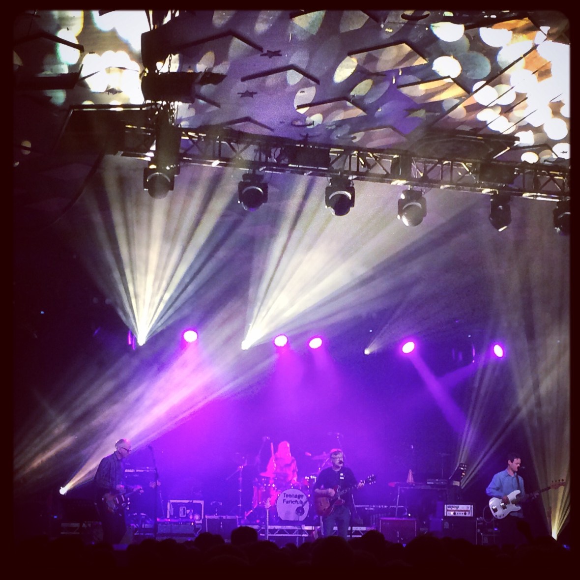 The re-released albums have seen much reappraisal for the old stuff. Thirteen in particular has gained real favour amongst the band’s faithful. Originally considered a mis-fire between the long-haired riffing on Bandwagonesque and the classicism of Grand Prix, it’s now seen as the equal of those early albums, the second one in in a 4 album run the equal of Bowie, The Beatles and all the very best. Played hot on the heels of a fizzing Bandwagonesque – highlights undoubtedly being a trippy Star Sign, the world-weary heavy sigh of Alcoholiday and a crystaline Guiding Star that wouldn’t have sounded out of place on The Velvet Underground And Nico – the tracks from Thirteen fired and fizzed, little napalm bombs of amped-up pop. Back on drums for the night, band jester Brendan O’Hare mimicked a heart attack as he worked his way into the count for the frantic knee tremble of Radio. Escher and Fear Of Flying ramped up mid-set proceedings, 1800 sillhouted heads bobbing in time to the steady throb coming from the stage. It’s the set closer though that sends everyone home on a high. Gene Clark has steadily become the hidden gem in the Fanclub’s stellar back catalogue; a chugging, riffing Neil Young workout named after The Byrds erstwhile maverick with Raymond McGinley pulling sounds from his guitar that J Mascis would willingly give his strumming hand for. To paraphrase Nigel Tuffnell, it’s all about the sustain, man.