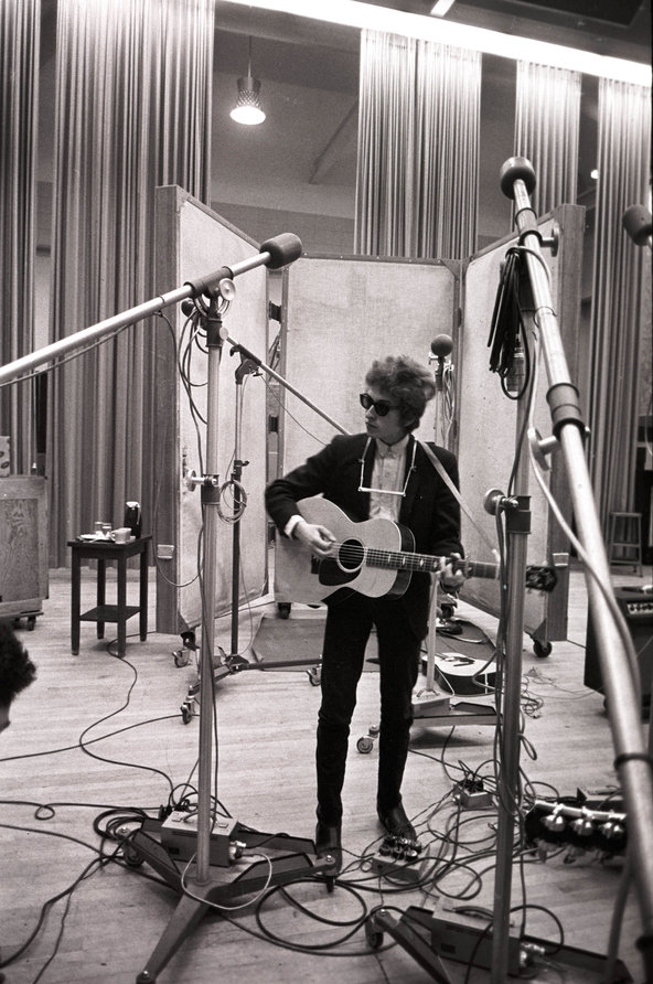 I always thought he looked like he was about to topple over, the mid 60s Bob Dylan. With the stripy pipe cleaner-thin spindles he called legs carrying the weight of that fantastic dark blue suede military jacket, the Ray-Bans stuck high up that hooked nose and the wildly exploding crow’s nest ‘fro, not to mention the ideas constantly forming and reforming in that speed-addled super-brain of his, it’s amazing that the top-heavy troubadour never once fell flat on his face. On the contrary, mid 60s Bob was The Man, one step ahead of his manager and his band and his audience, barely giving consideration to anyone willing and able to catch up with him.